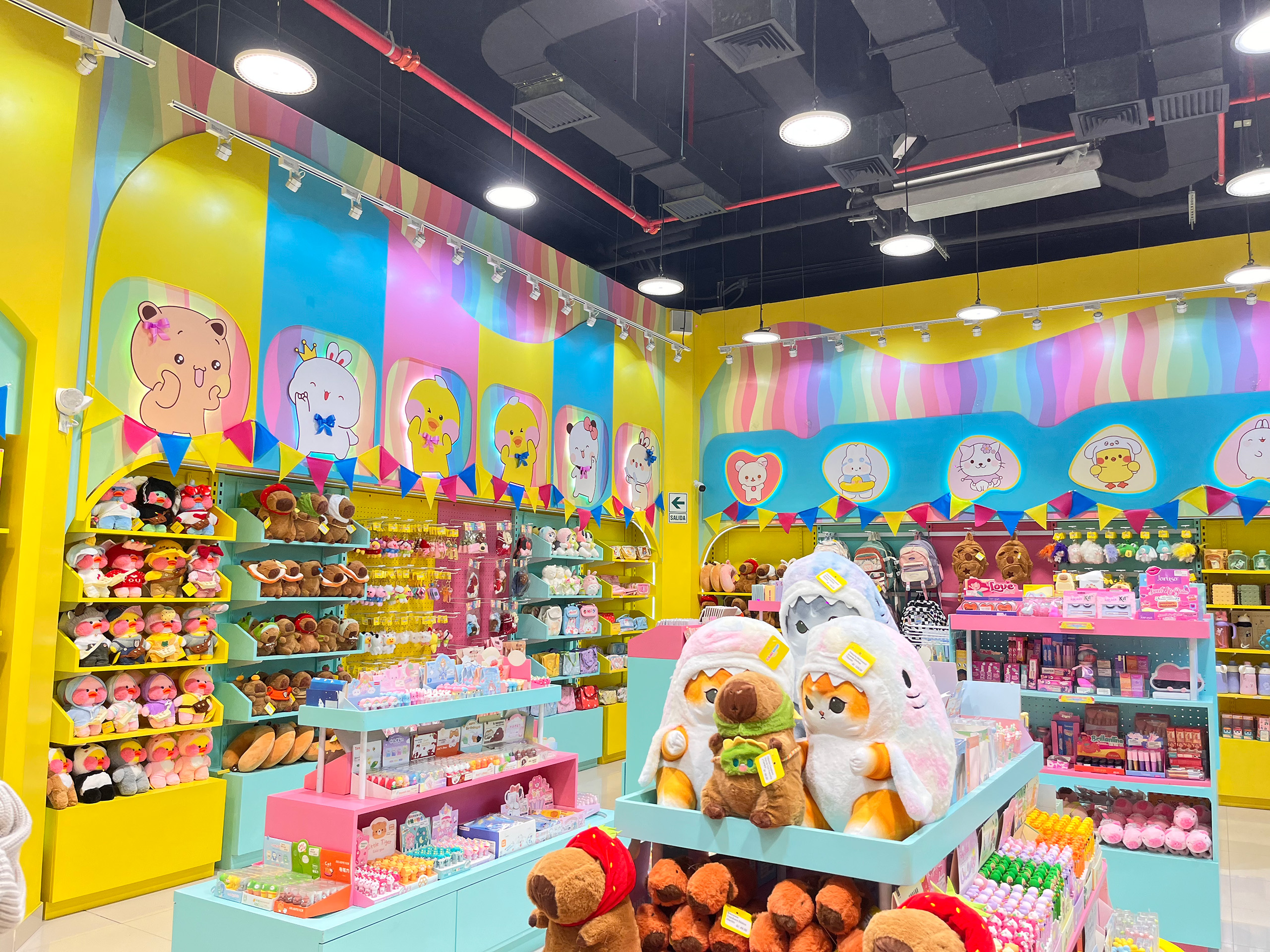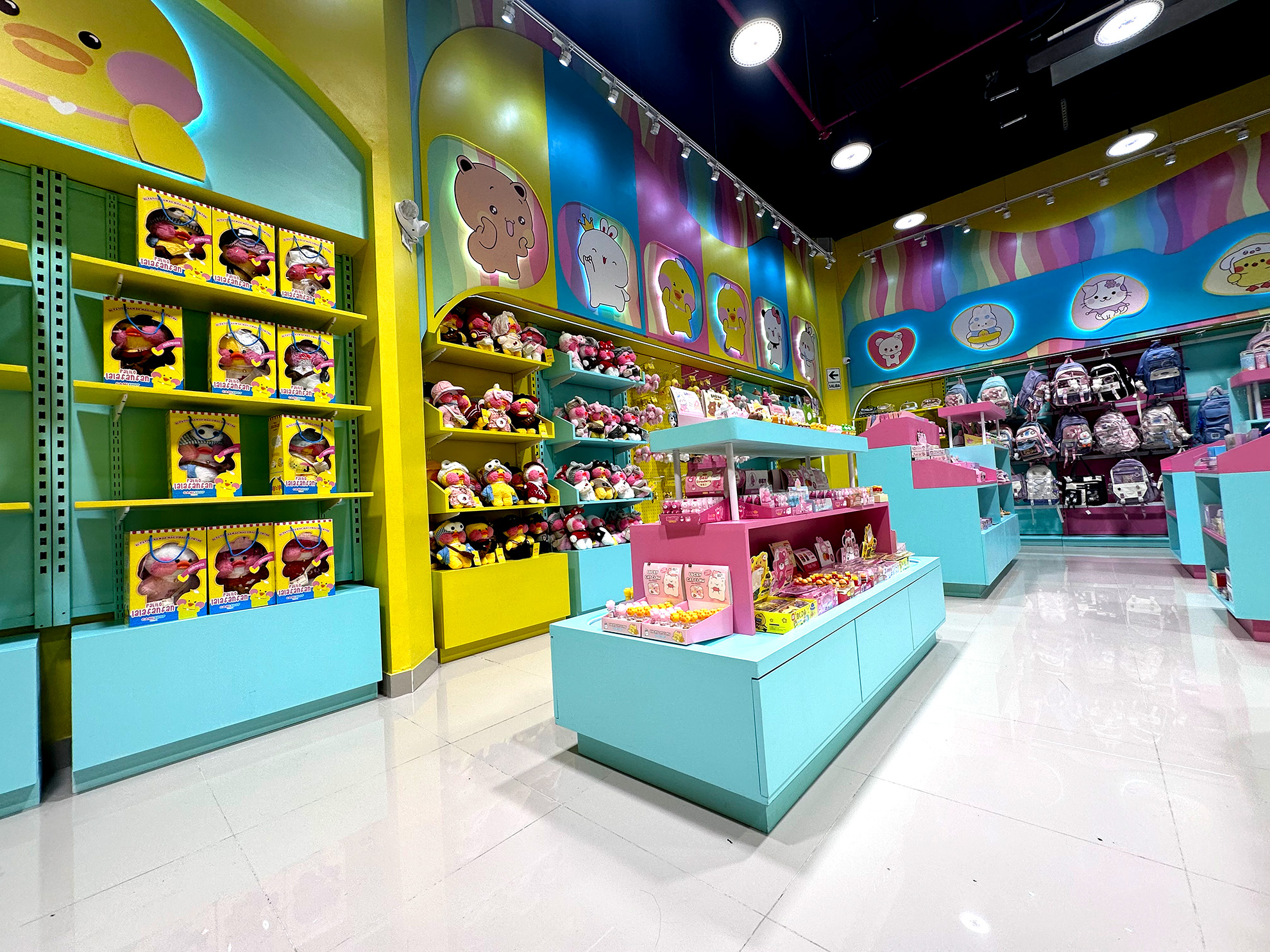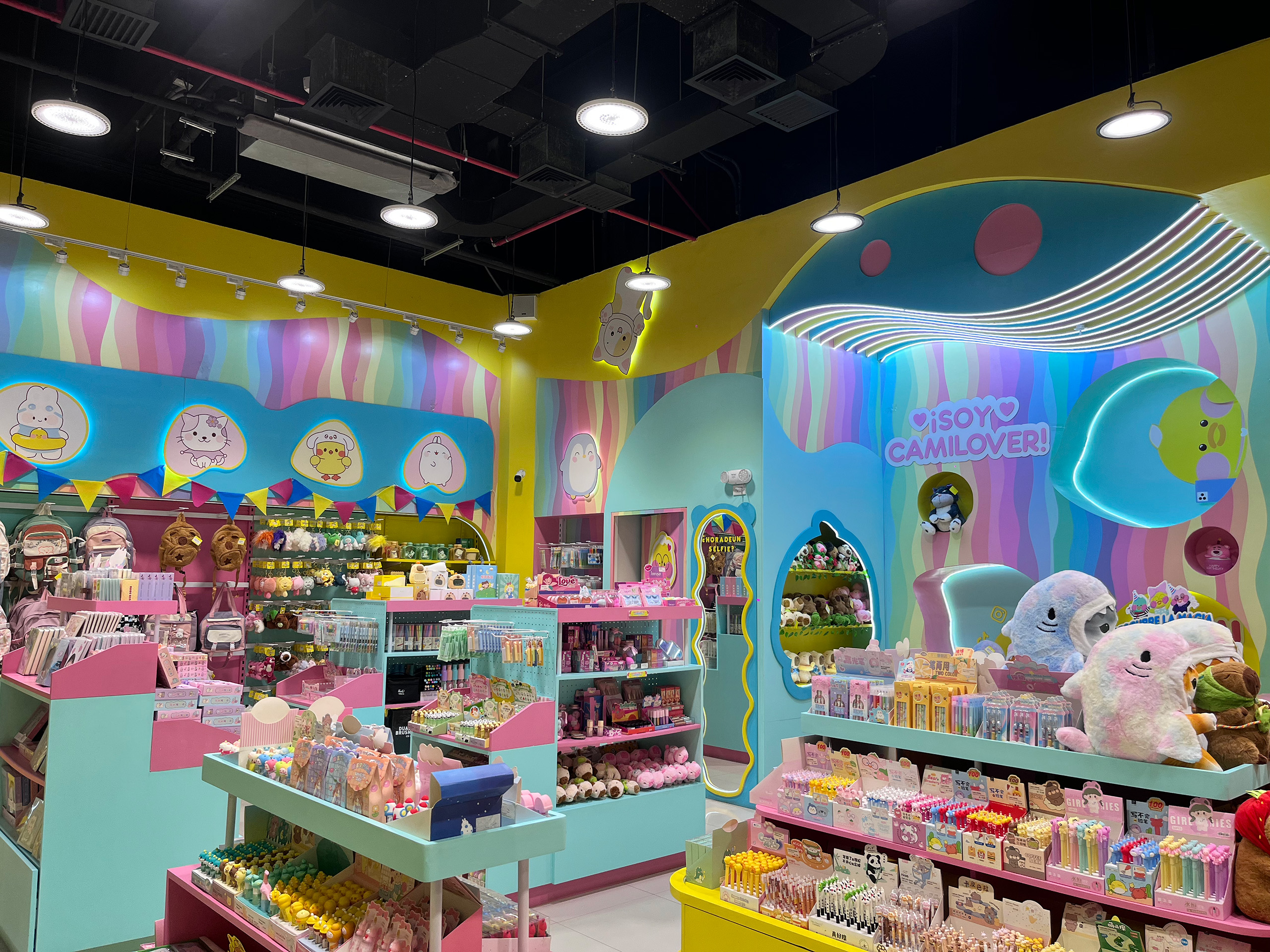 El local comercial de CAMISHOP se caracteriza por un diseño lúdico y vibrante, utilizando una paleta de colores llamativos como el amarillo, azul, rosa y verde, que crean un ambiente alegre y atractivo, ideal para un público joven o infantil. Las paredes y los expositores están decorados con personajes y gráficos divertidos, lo que refuerza el enfoque temático y crea una experiencia inmersiva para los clientes. La iluminación es brillante y uniforme, destacando los productos y añadiendo un toque de energía al espacio.