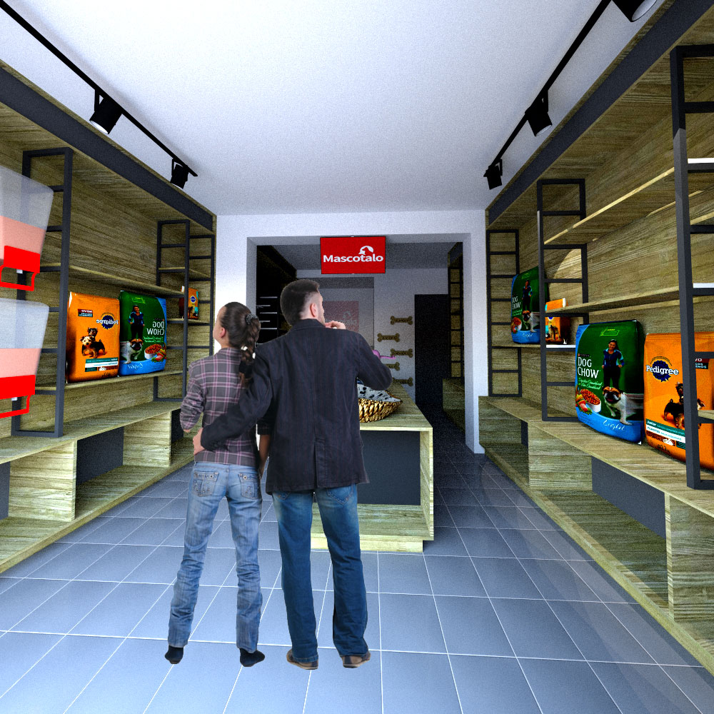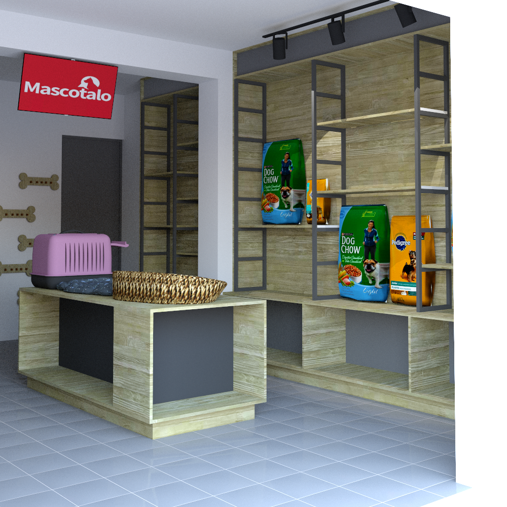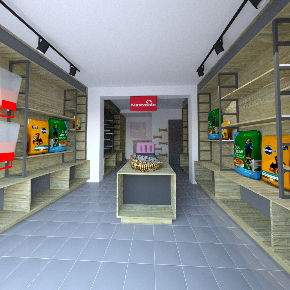 El diseño optimiza el uso del espacio con estanterías integradas en las paredes y un mostrador central que permite una circulación fluida. Los productos están organizados de manera accesible, con alimentos y accesorios claramente visibles para los clientes. El logo de la tienda y algunos elementos decorativos específicos para mascotas refuerzan la identidad de la marca. En conjunto, el espacio está diseñado para ser funcional y acogedor, proporcionando una experiencia de compra cómoda y atractiva para los amantes de las mascotas.