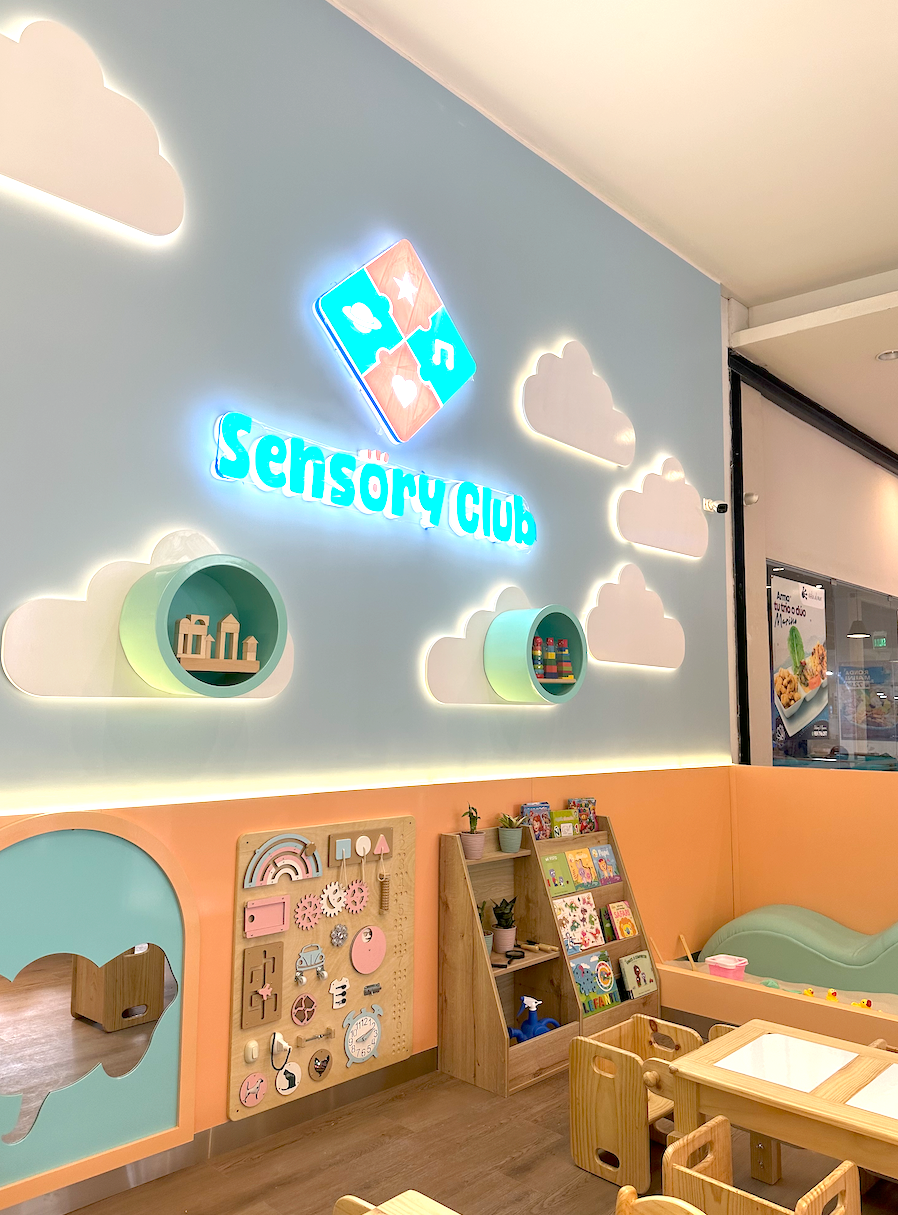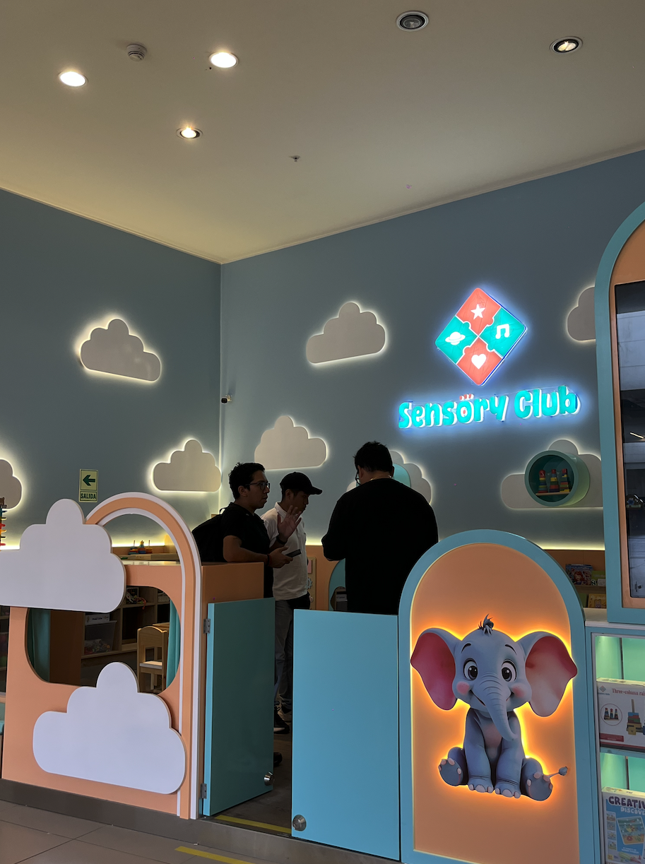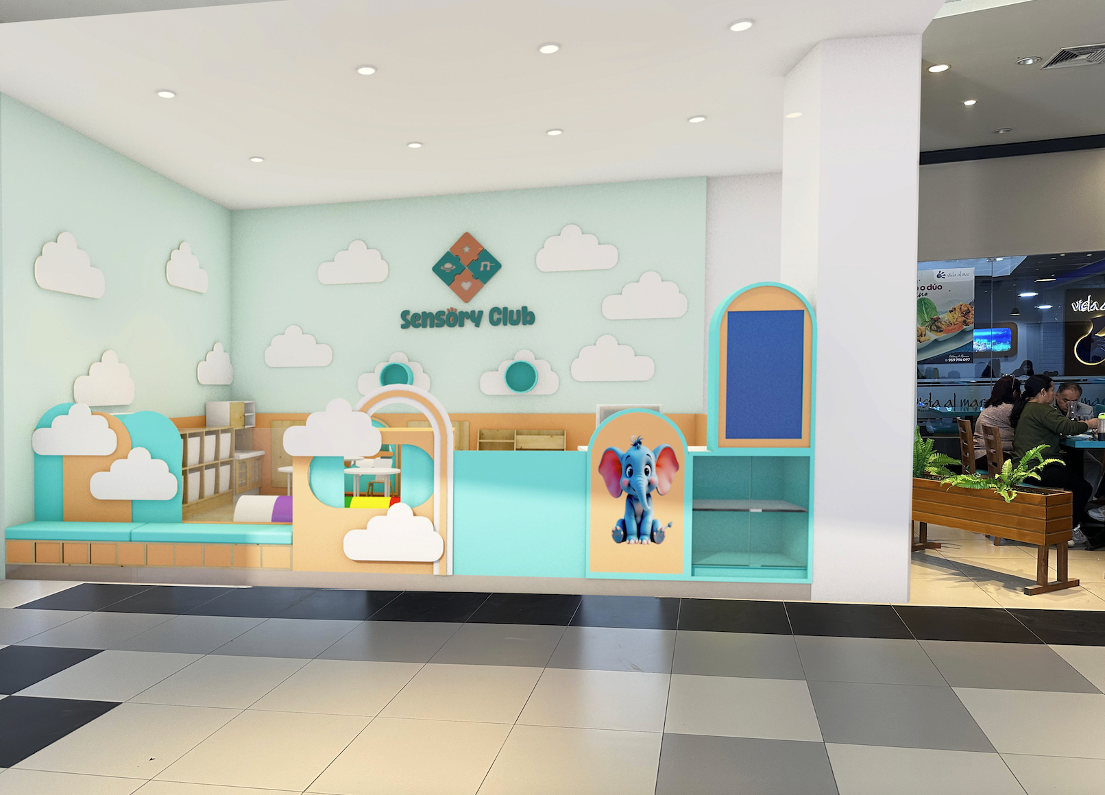 El concepto arquitectónico de Sensory Club está diseñado para crear un espacio cálido, lúdico y seguro donde los niños puedan explorar, aprender y divertirse a través de los sentidos. La atmósfera está cuidadosamente construida con formas suaves, colores pastel y elementos visuales como nubes iluminadas, que evocan tranquilidad y estimulan la imaginación. Cada rincón invita a la interacción, incorporando materiales didácticos accesibles y zonas de juego sensorial que promueven el desarrollo cognitivo y emocional.