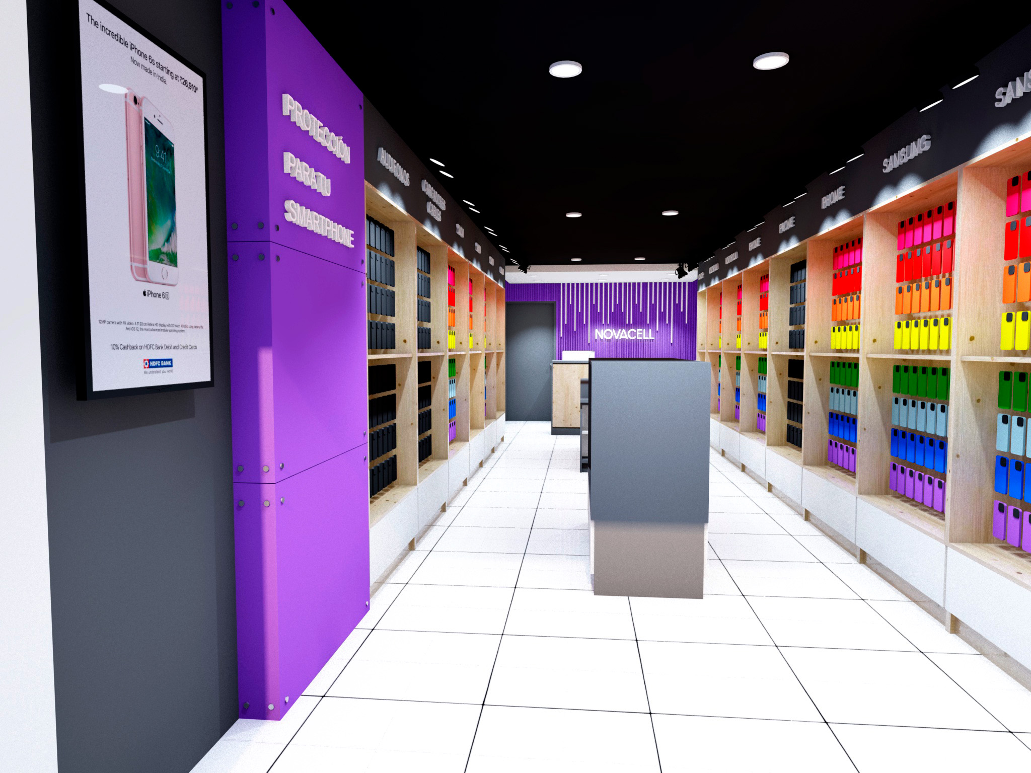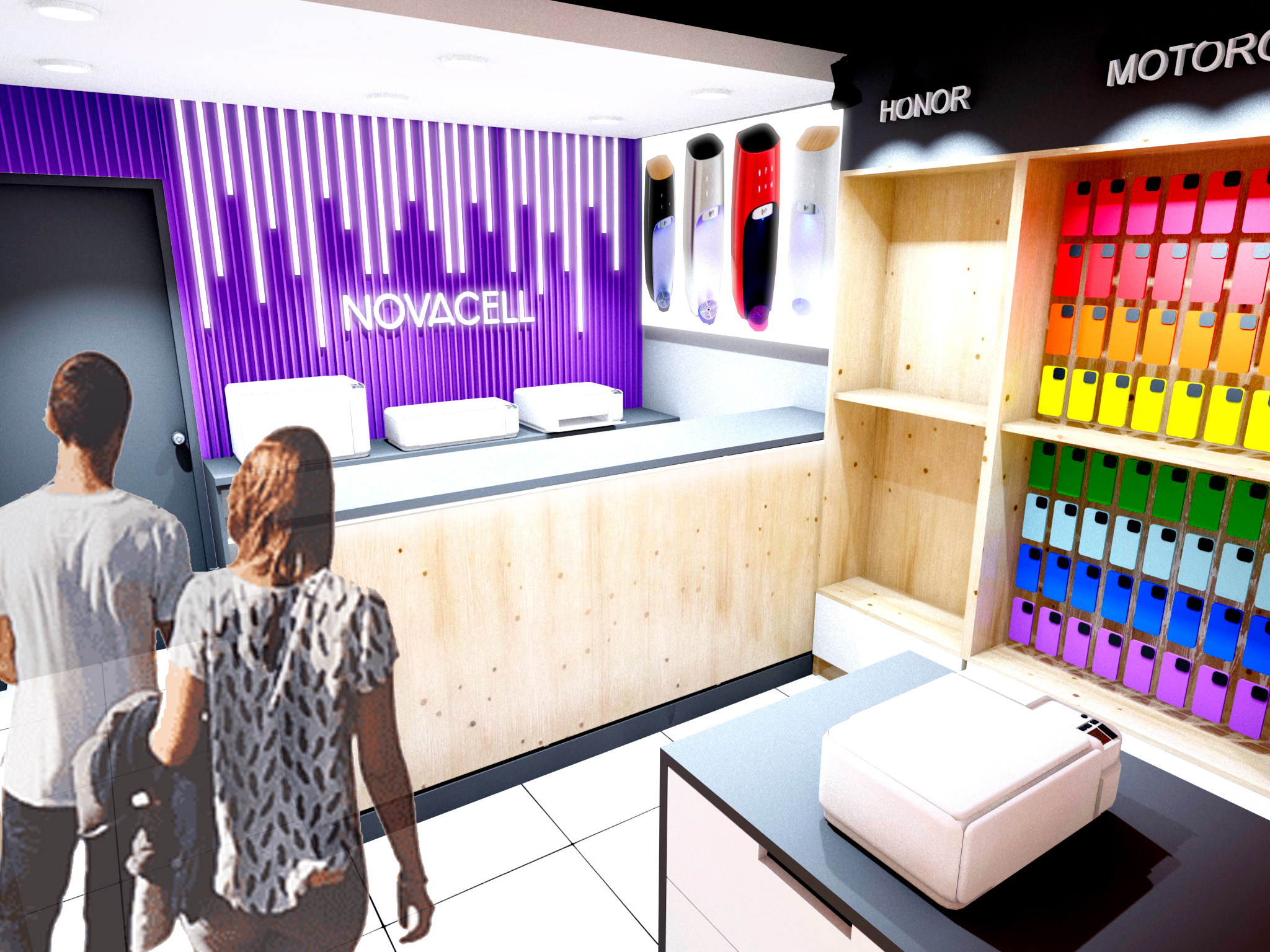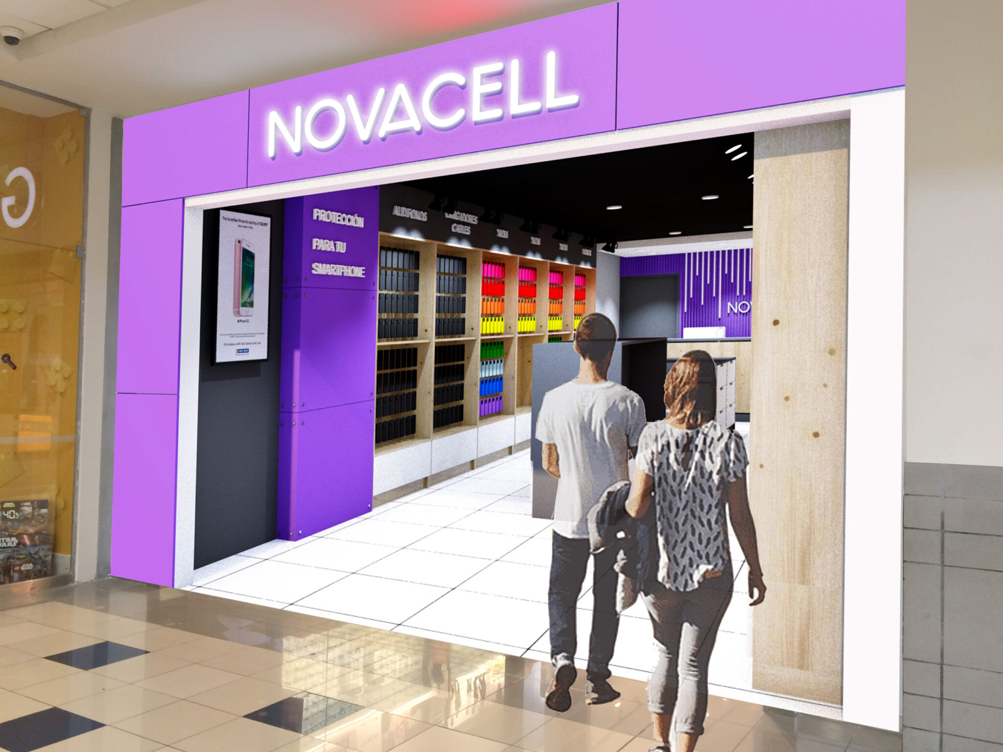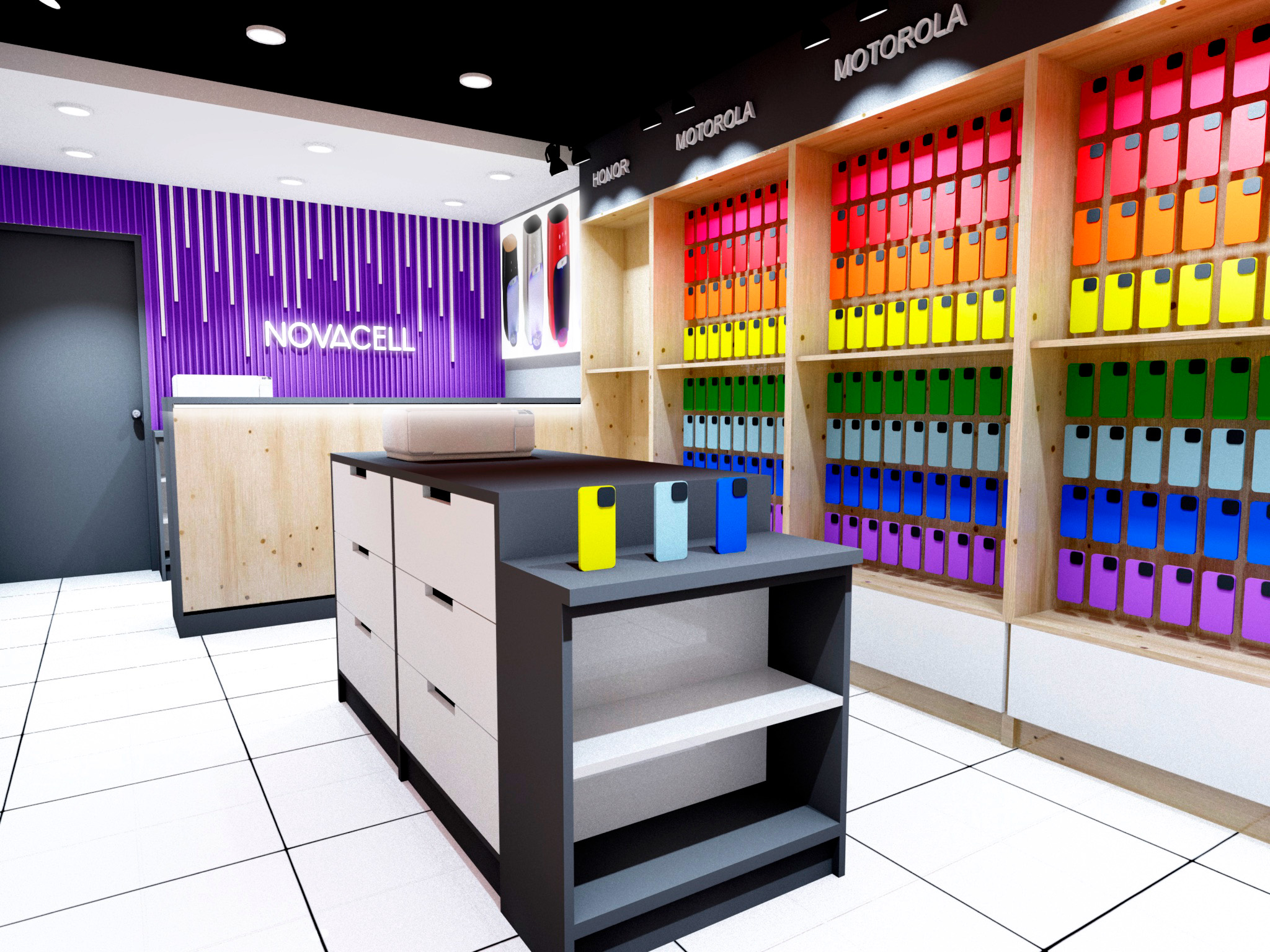 El diseño de Novacell equilibra funcionalidad y estética con una distribución estratégica que optimiza la exhibición de productos. La paleta cromática vibrante resalta la diversidad de accesorios, mientras que la madera aporta calidez y contraste con los acabados modernos.