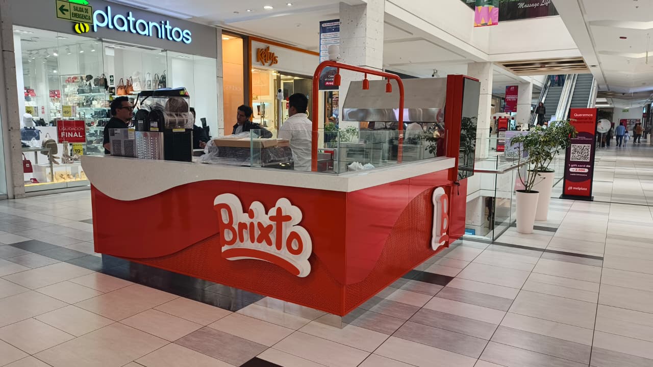 El módulo de Brixto presenta un estilo arquitectónico moderno y funcional, diseñado para destacar en el entorno comercial del centro comercial. Su forma perimetral con líneas curvas y suaves genera un flujo visual dinámico, mientras que el uso del color rojo intenso —característico de la marca— crea un punto focal inmediato que capta la atención del público. El material de superficie sólida en tonos claros aporta contraste, limpieza visual y una sensación de orden y amplitud, reforzando la percepción de calidad e higiene tan importante en espacios gastronómicos.