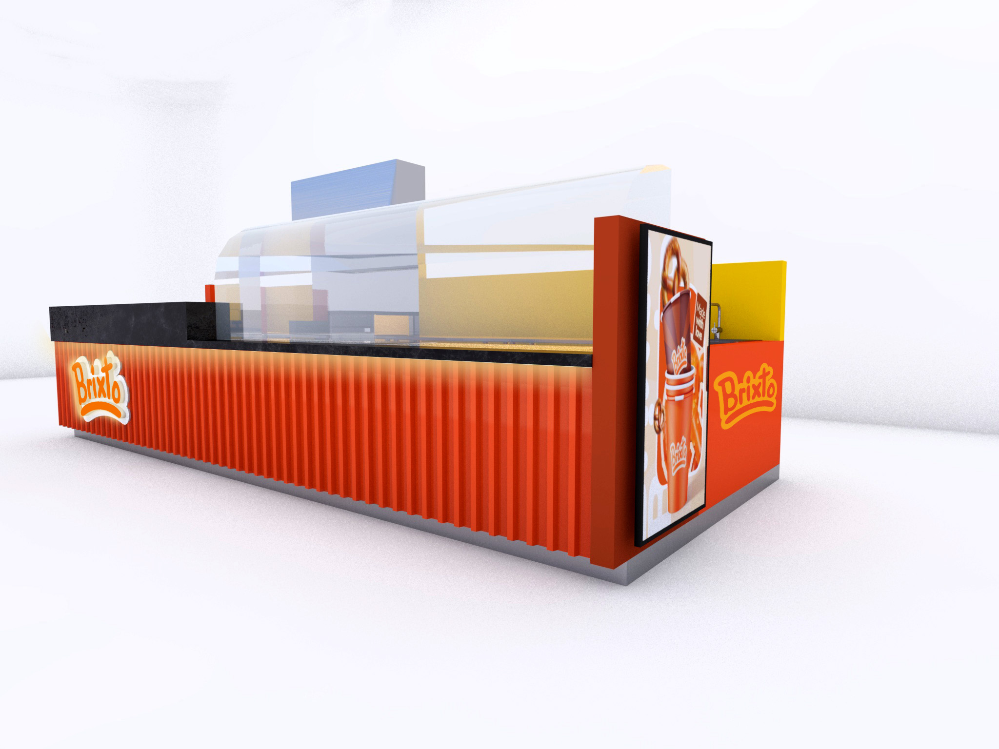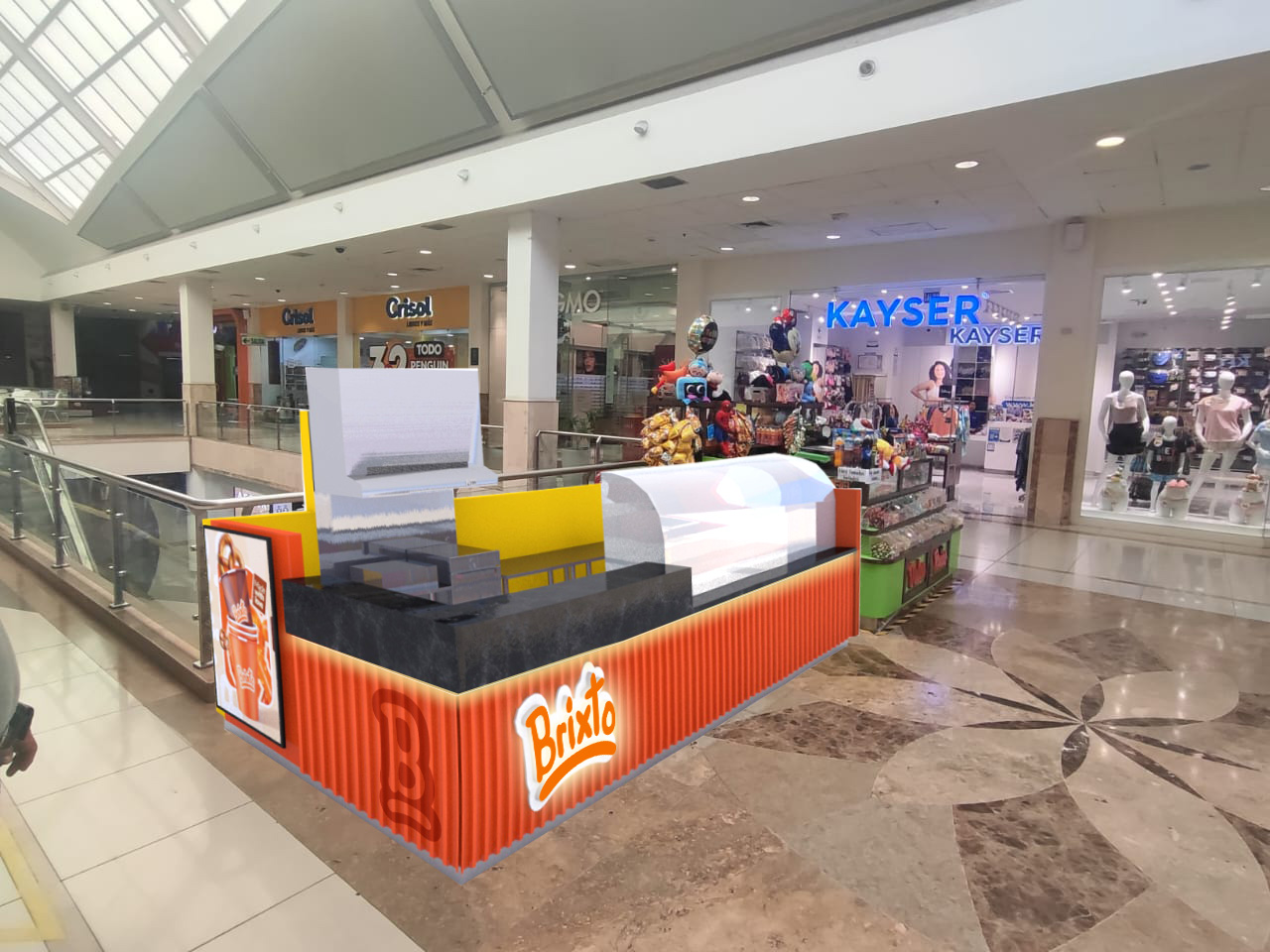 El concepto arquitectónico del módulo de Brixto está enfocado en crear una experiencia visual divertida, enérgica y fácil de identificar. Utiliza una paleta de colores cálidos y vibrantes —como el naranja, rojo y amarillo— que transmite dinamismo y alegría, al mismo tiempo que refuerza la identidad de la marca. Los gráficos grandes y envolventes, junto con un logotipo iluminado, logran captar la atención desde cualquier ángulo, generando un punto de venta memorable y llamativo dentro de centros comerciales o zonas de alto tránsito.