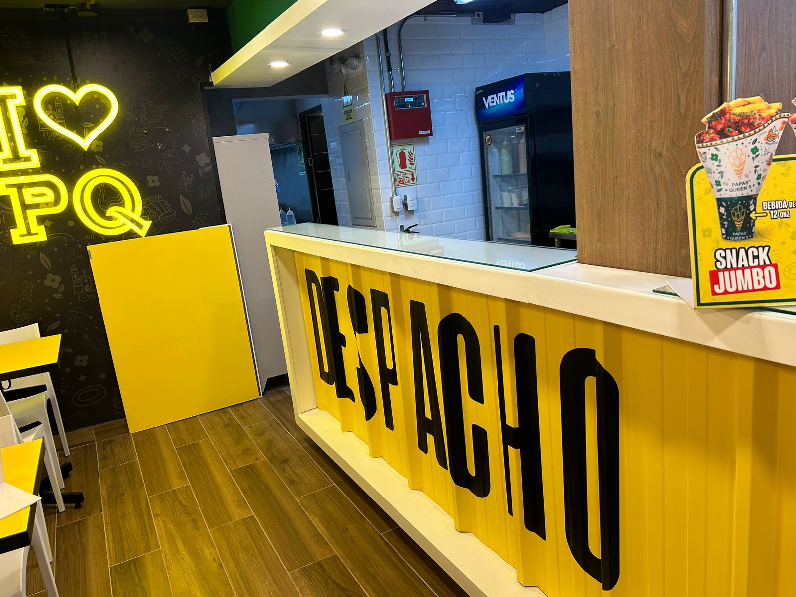 Este espacio se define por una estética vibrante y contemporánea, donde la combinación de madera, mobiliario amarillo y detalles industriales genera un ambiente dinámico y acogedor. El techo expuesto, con su estructura y ductos visibles, refuerza el carácter urbano del diseño, mientras que la iluminación focalizada aporta calidez y define zonas de uso.