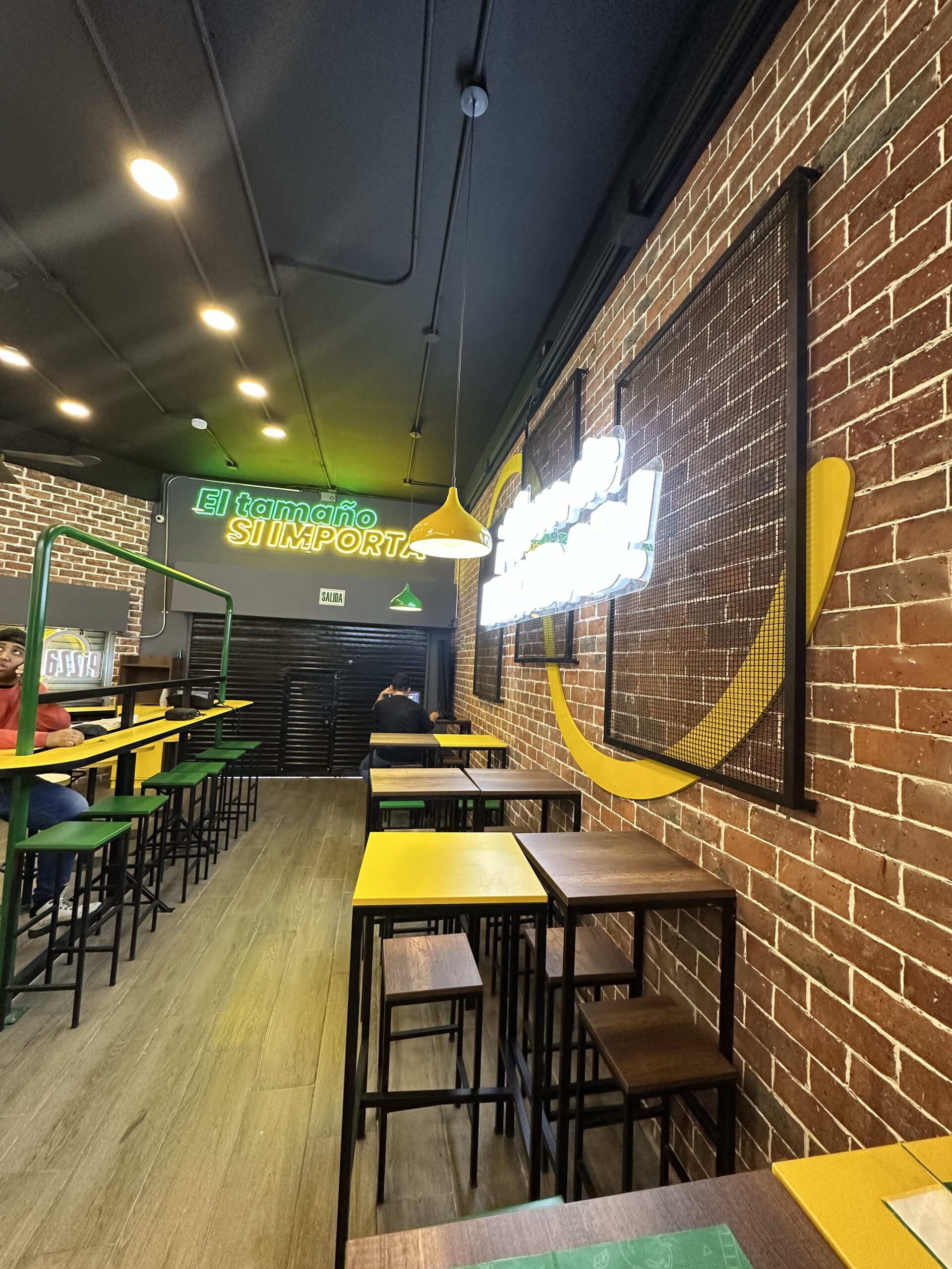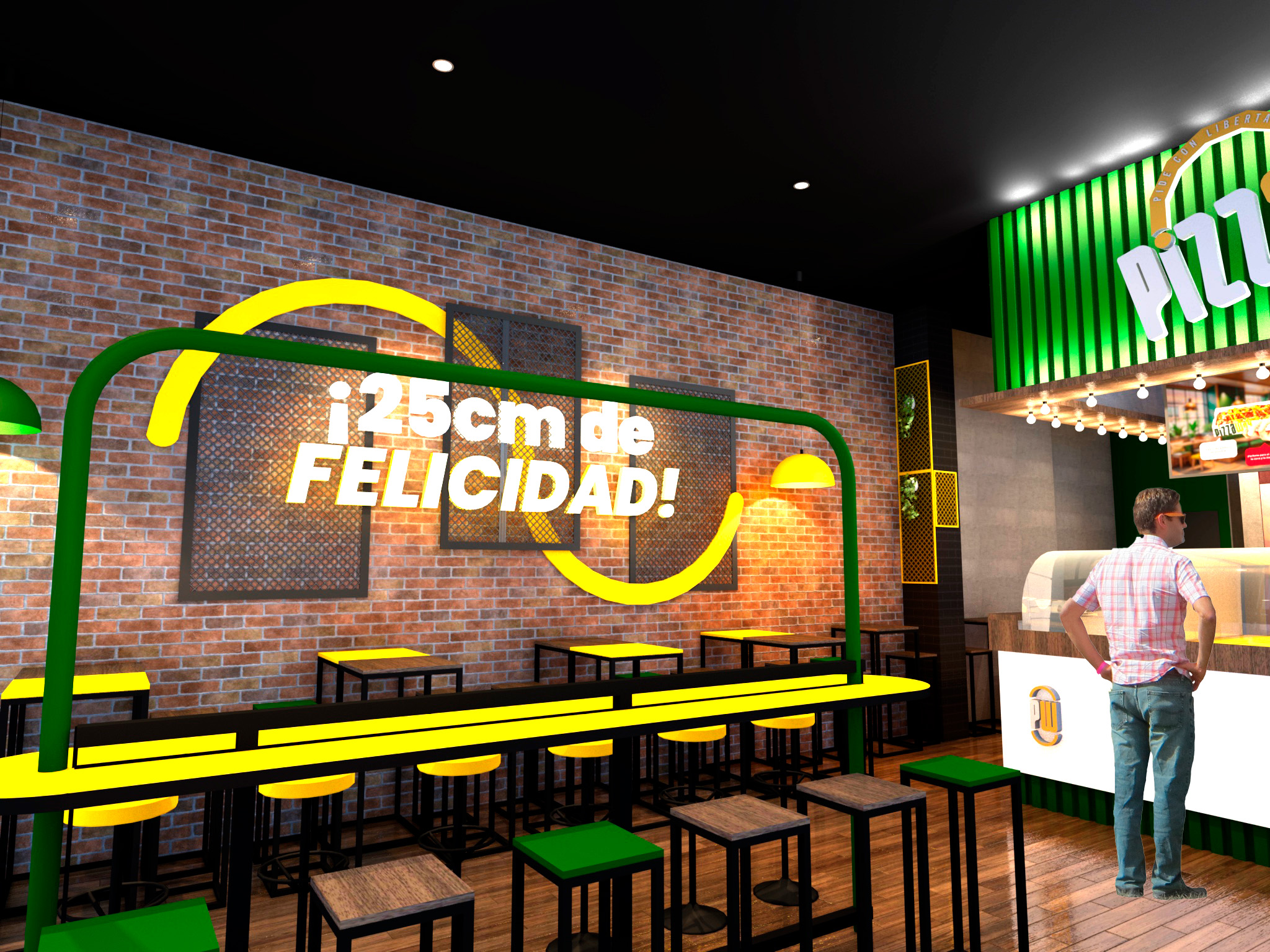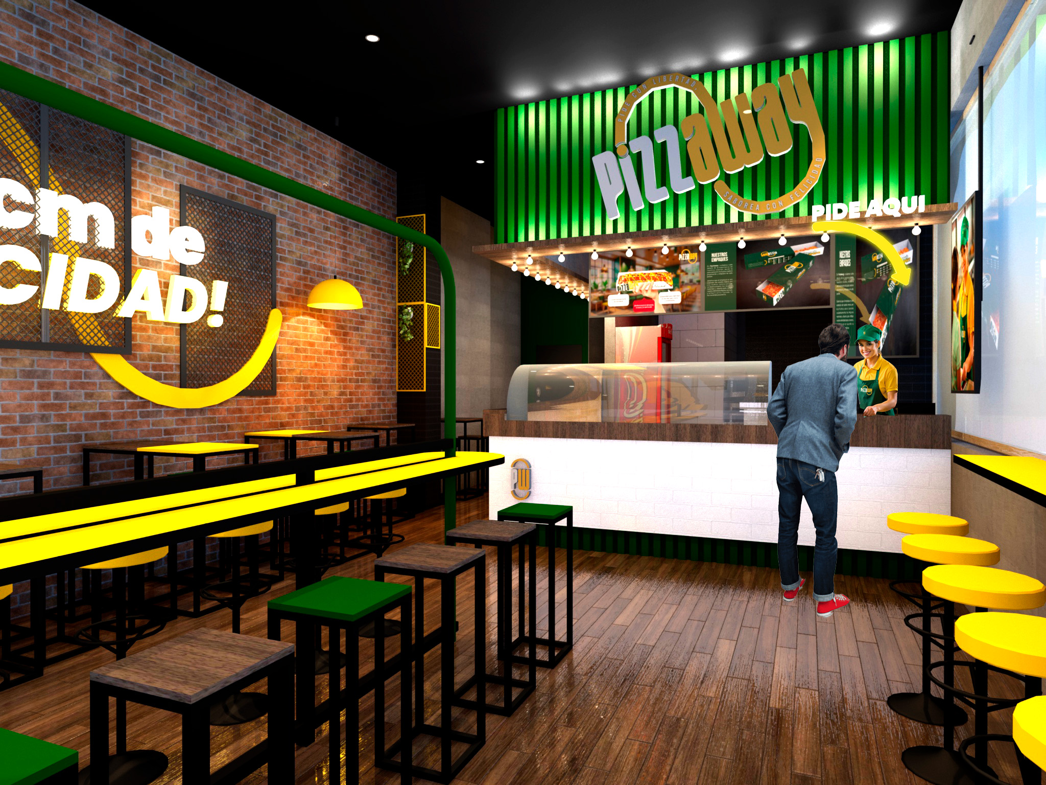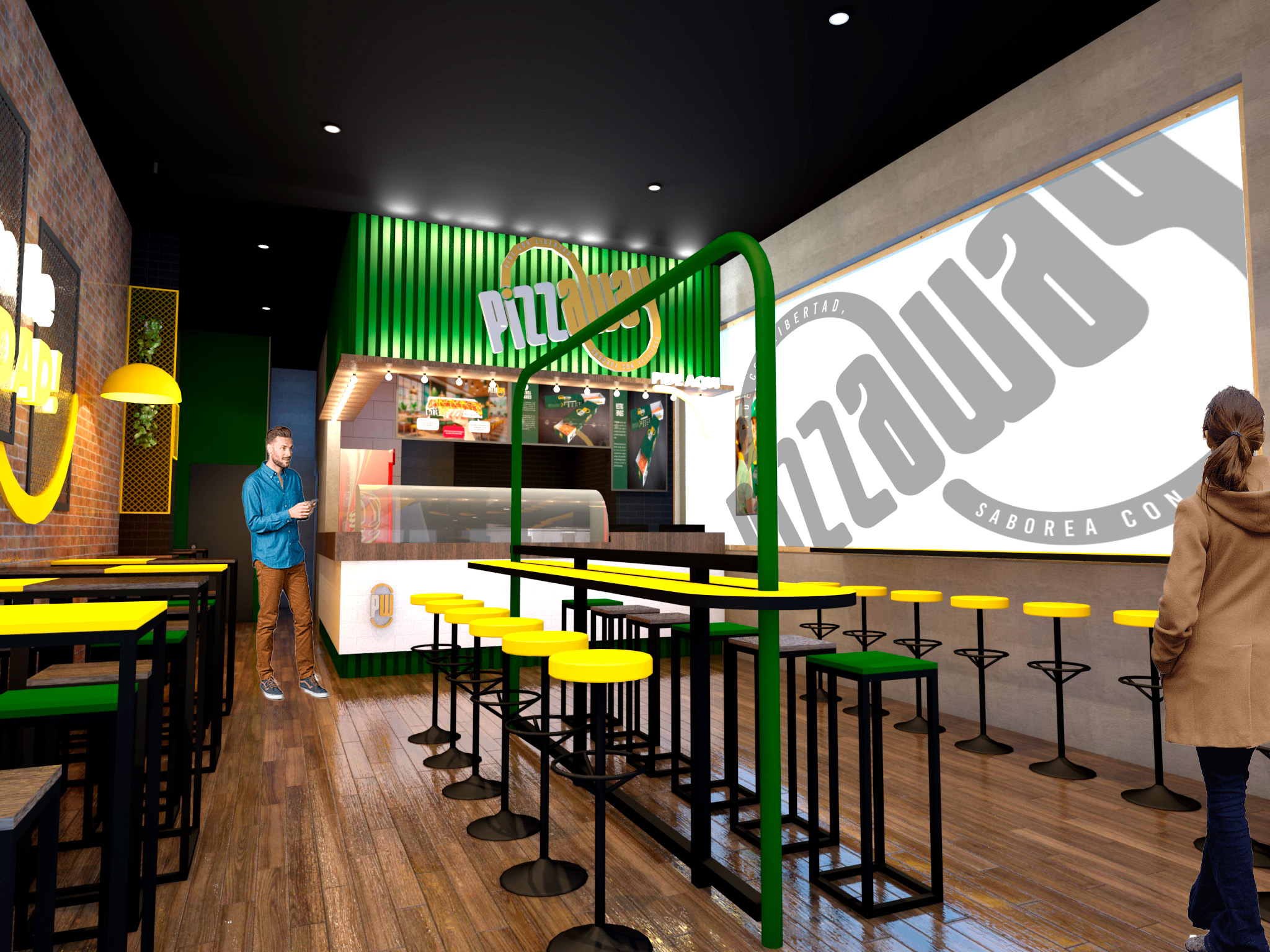 La identidad visual de PIZZA WAY combina elementos industriales contemporáneos con una paleta cromática fresca y vibrante. El contraste entre los acabados profesionales (acero inoxidable, subway tiles negros) y los elementos gráficos en verde y amarillo genera un ambiente dinámico y moderno. La iluminación LED perimetral no solo cumple una función práctica sino que también define dramáticamente el área de trabajo, mientras que la señalética en el fondo refuerza la identidad de marca. El diseño logra equilibrar la funcionalidad operativa con una estética que invita a la permanencia y socialización del