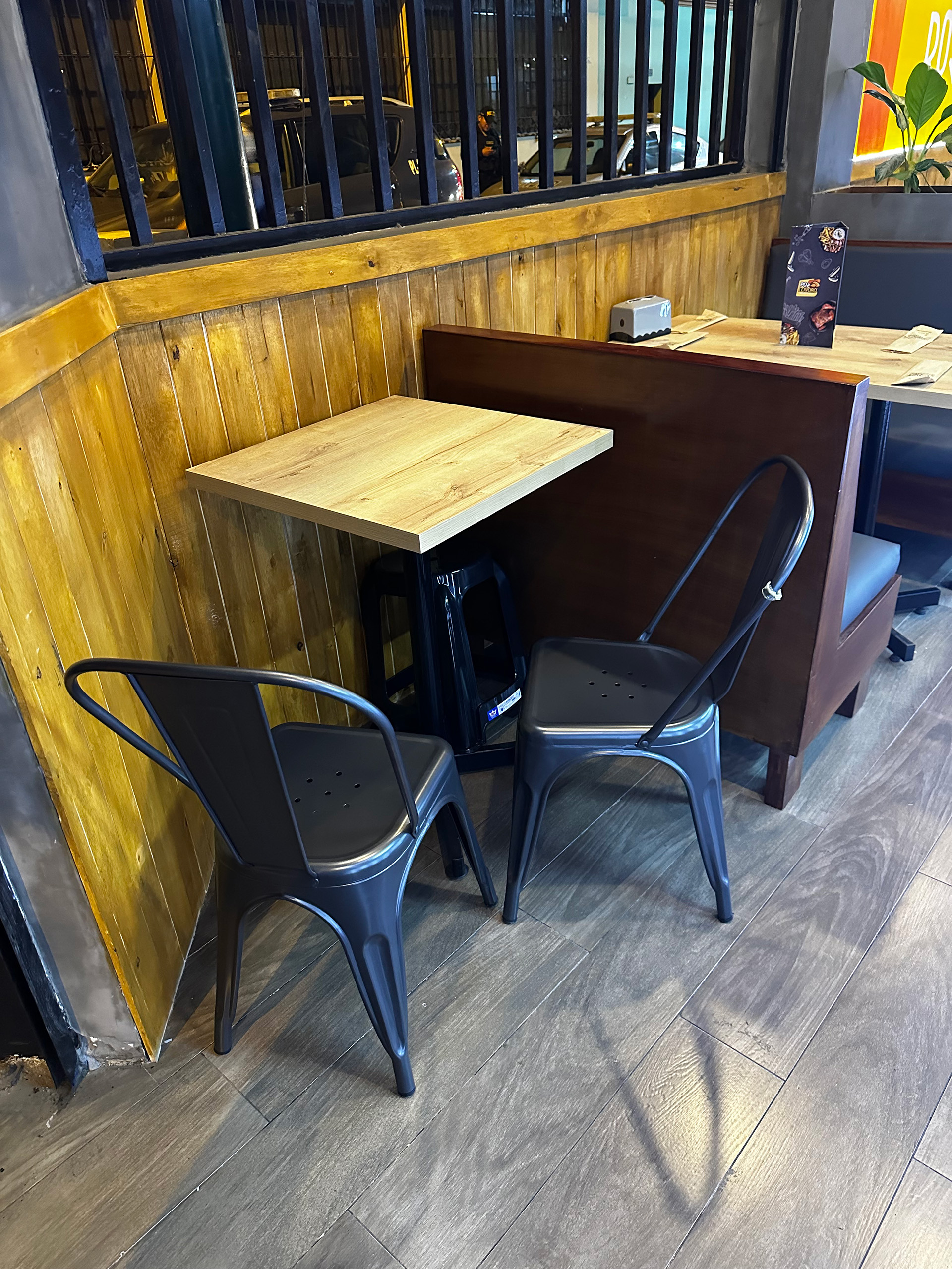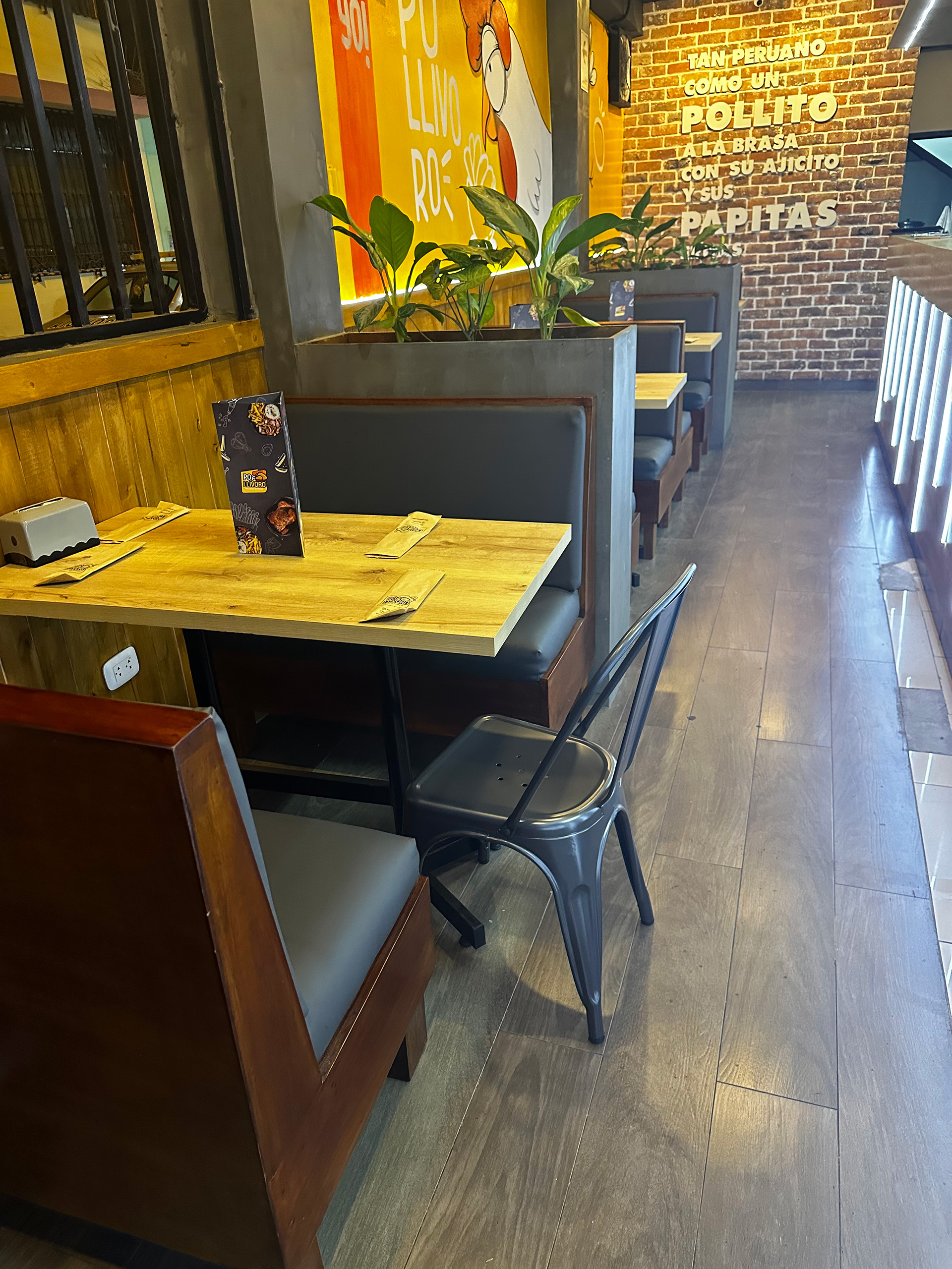 El diseño interior del restaurante responde a una cuidadosa planificación espacial, optimizando la distribución funcional de los elementos y creando un ambiente y eficiente. Los materiales utilizados, como la madera y el metal, son resistentes y fáciles de mantener, garantizando la durabilidad del mobiliario.