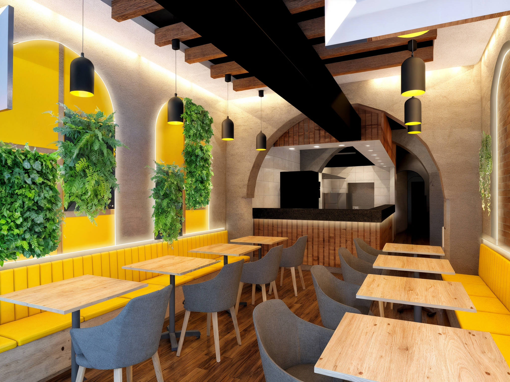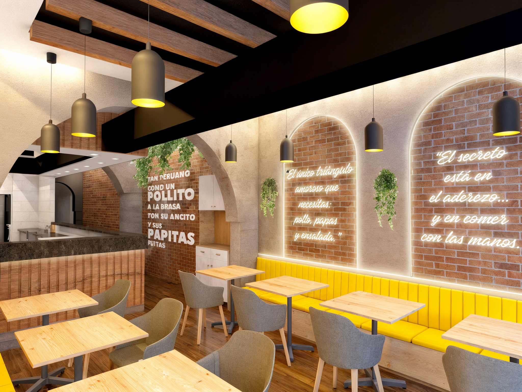Ubicado en el distrito de Miraflores, el restaurante apuesta por un ambiente moderno sin perder la esencia de lo tradicional. El uso de acentos en color amarillo genera vitalidad y frescura, mientras que las estructuras curvas y detalles en vegetación brindan un toque contemporáneo y acogedor. El resultado es un espacio funcional, estético y lleno de identidad, ideal para disfrutar del “pollito con papitas” en un entorno que celebra lo peruano.